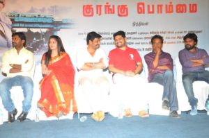 இயக்குநர் இமயம் பாரதிராஜா, விதார்த் இணைந்து நடிக்க, நித்திலன் இயக்கத்தில் உருவாகி உள்ள படம் “குரங்கு பொம்மை”. இந்த படத்தின் பாடல்கள் வெளியீடு சென்னையில் நடைபெற்றது. இந்த படத்தின் பத்திரிகையாளர் சந்திப்பில் பேசிய கதாநாயகன் விதார்த், “இயக்குநர் இமயம் பாரதிராஜா அவர்கள் மிக மிக சிறப்பாக நடித்திருக்கிறார். அவருடன் எனக்கு நிறைய காம்பினேஷன் காட்சிகள் இல்லை. ஆனால், அவரது காட்சிகள் படப்பிடிப்புக்கு நடக்கும்போது அருகில் இருந்து கவனிப்பேன். மிக யதார்த்தமாக நடித்திருக்கிறார் என்பதை விட வாழ்ந்திருக்கிறார் என்று தான் சொல்ல வேண்டும். அதனால் நிச்சயமாக இந்த படத்தில் சிறந்த நடிப்பிற்காக தேசியவிருது நிச்சயம் வாங்குவார், நமது இயக்குநர் இமயம் ”என்றார்.