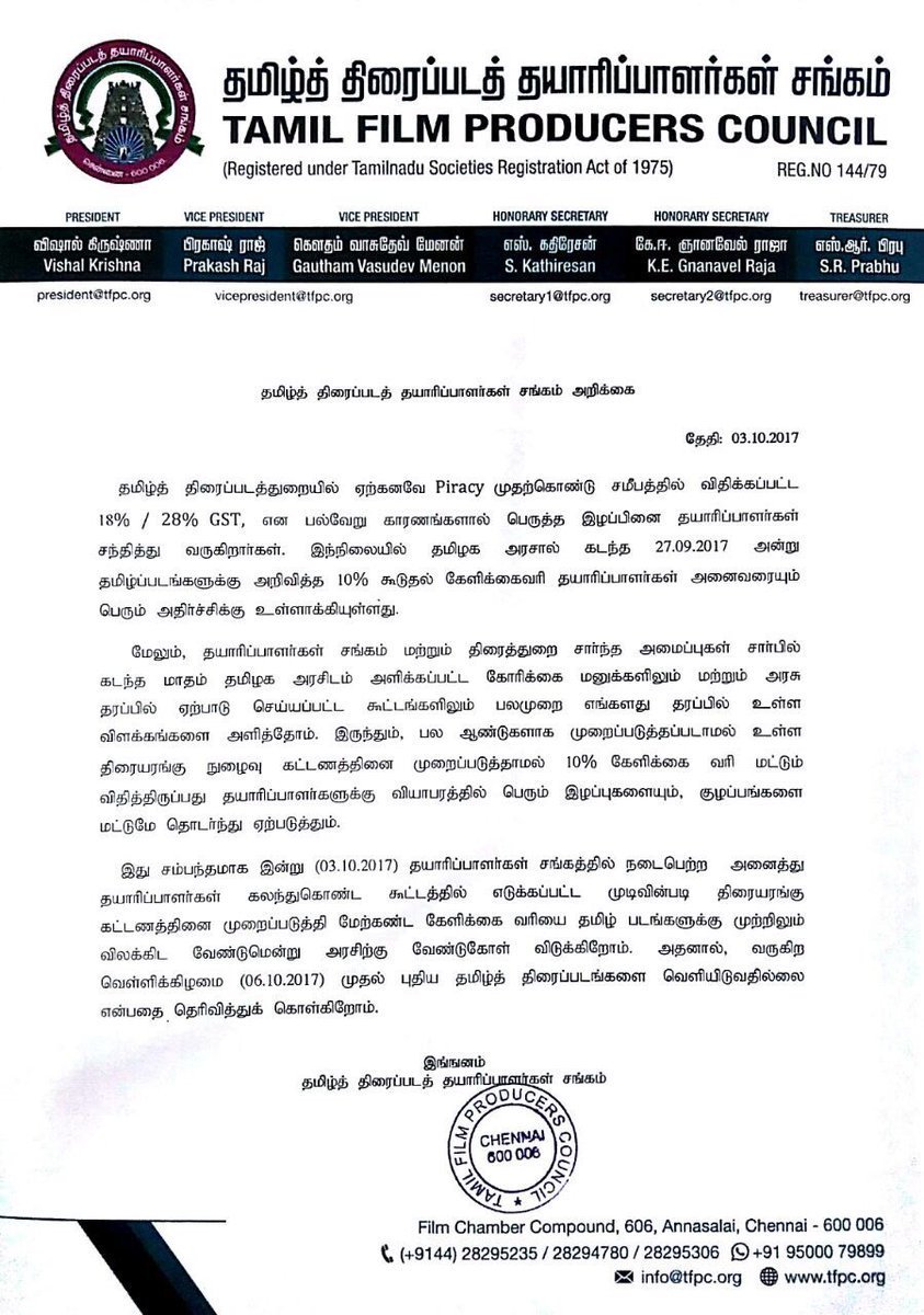 இதுகுறித்து, தமிழ்த் திரைப்பட தயாரிப்பாளர் சங்கம் தெரிவித்திருப்பதாவது: