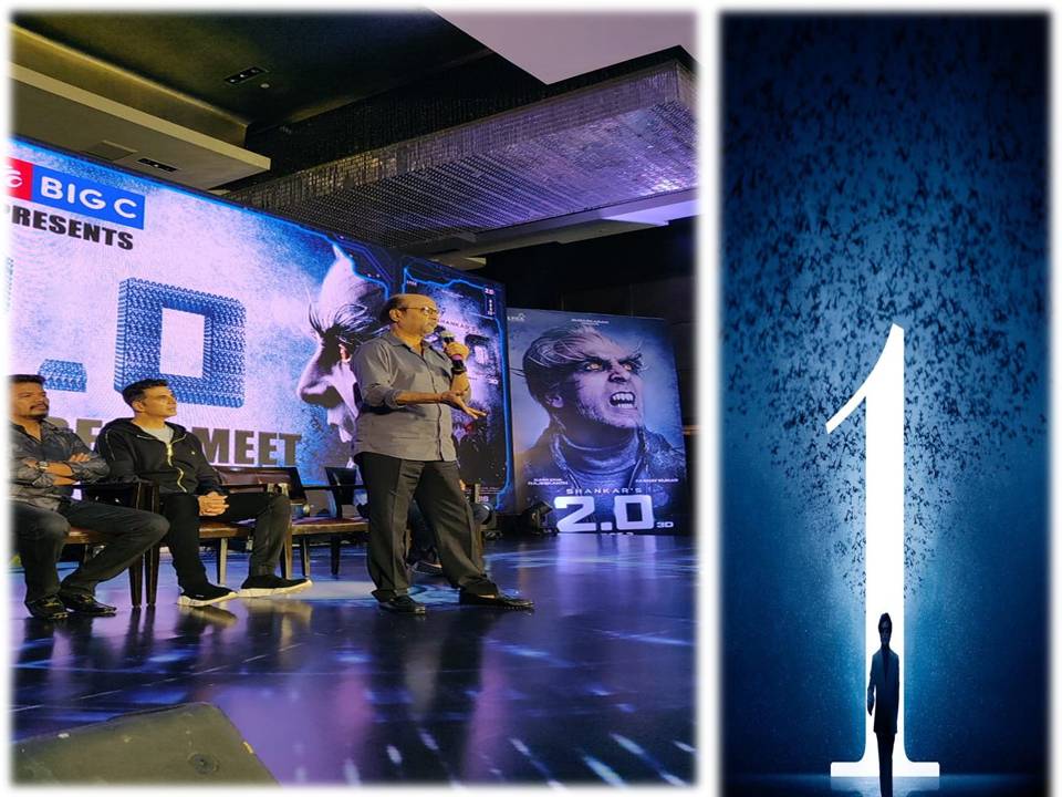 இந்திய சினிமா ரசிகர்கள் பலரும் மிகவும் எதிர்பார்த்து காத்திருக்கும் படம் 2.0. ரஜினிகாந்த், அக்ஷய் குமார் நடிப்பில் 3D வடிவில் உருவாகியுள்ள இப்படத்தை ஷங்கர் இயக்கியுள்ளார். நாளை (29 ம் தேதி) ரிலீஸ் ஆகவுள்ள இப்படத்தின் புக்கிங் ஆரம்பித்து சில மணி நேரங்களில் முடிந்துவிட்டது. உலகம் முழுவதும் 10,000 திரையங்குகளுக்கு மேல் ரிலீஸ் ஆகவுள்ளது. மேலும் இது 12000 ஆகா மாறும் என தெரிகிறது. ஒரு தமிழ் தமிழ் படம் இத்தனை திரையரங்குகளில் வெளியாவது இதுவே முதல் முறை.இதை ரஜினியின் 2.0 USAவில் மட்டும் 800க்கும் அதிகமான திரையரங்குகளில் வெளியாகிறதாம். தமிழ்- 307 திரையரங்குகள், தெலுங்கு- 270 திரையரங்குகள், ஹிந்தி- 223 திரையரங்குகள், மொத்தம்- 800 திரையரங்குகள் வெளிநாட்டில் ஒரு தமிழ் படத்துக்கு இது அதிகம் என்று கூறப்படுகிறது. இதைத்தொடர்ந்து படக்குழுவினர் ஐதராபாத்தில் நடந்த நிகழ்ச்சியில் நிருபர்களை சந்தித்தனர்.